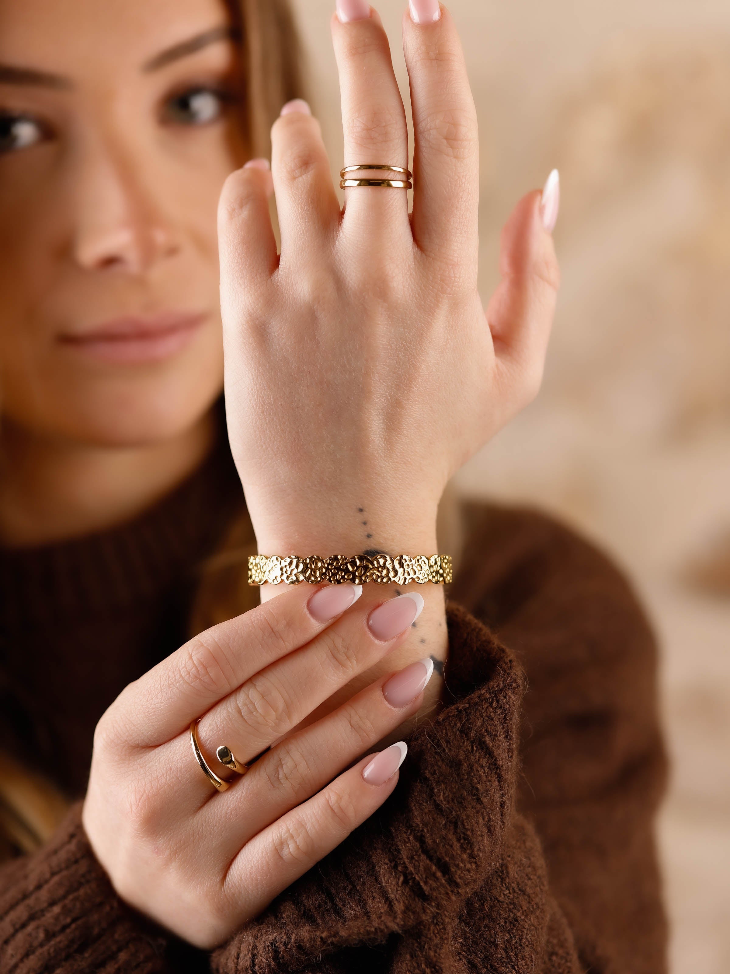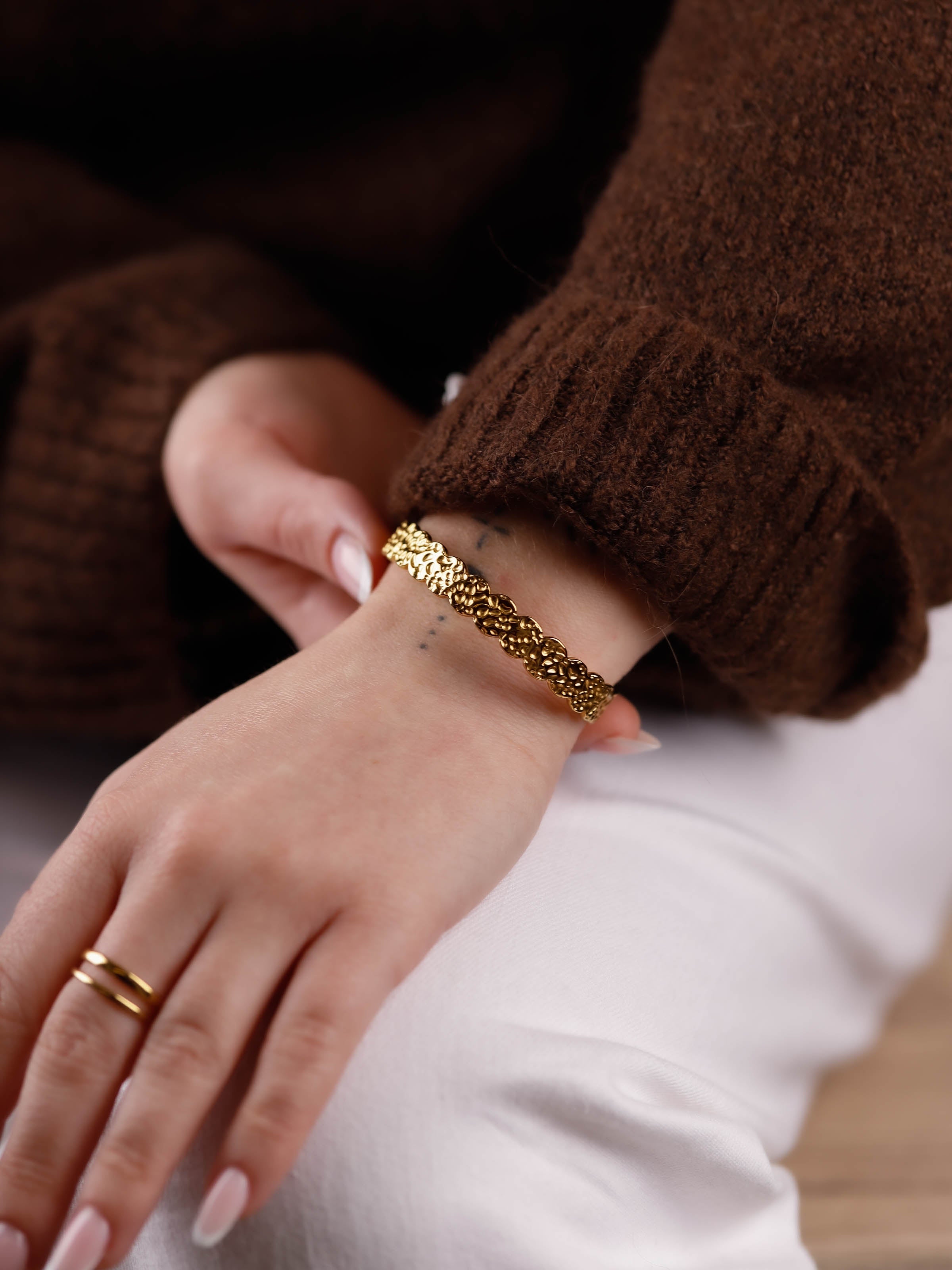 Comment porter ce bracelet jonc avec vos tenues ? Look décontracté : Associez-le à une blouse fluide et un jean pour un style simple mais élégant. Style chic : Portez-le avec une chemise blanche et un pantalon en tailleur pour un look professionnel soigné. Tenue de soirée : Combinez-le à une robe longue ou une combinaison en satin pour une allure raffinée. Esprit bohème : Associez-le à plusieurs bracelet en joncs et une robe légère pour un look féminin et naturel. Le bracelet femme Anastasia est l’accessoire parfait pour ajouter une touche de brillance à vos tenues quotidiennes ou élégantes.